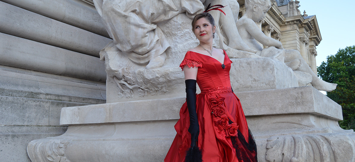 À l’occasion d’un bal donné au Petit Palais, j’ai réalisé cette robe à tournure en satin rouge et dentelle noire. La construction du Petit Palais datant de l’exposition universelle de 1900, je me suis inspirée de cette période pour créer un modèle mêlant “costume historique” et “haute couture”, puisque c’est à cette époque que Charles Frederick Worth “invente” la haute couture.