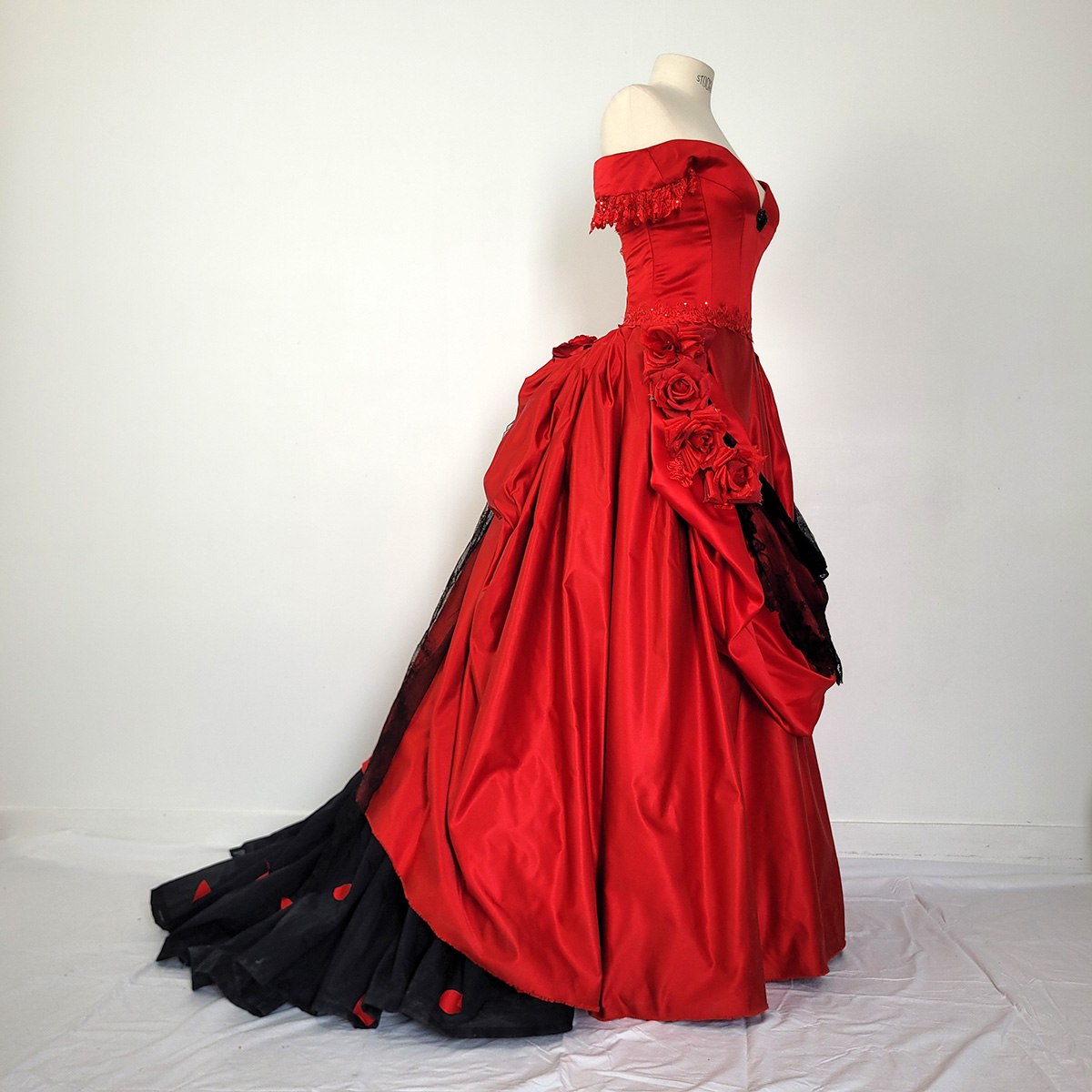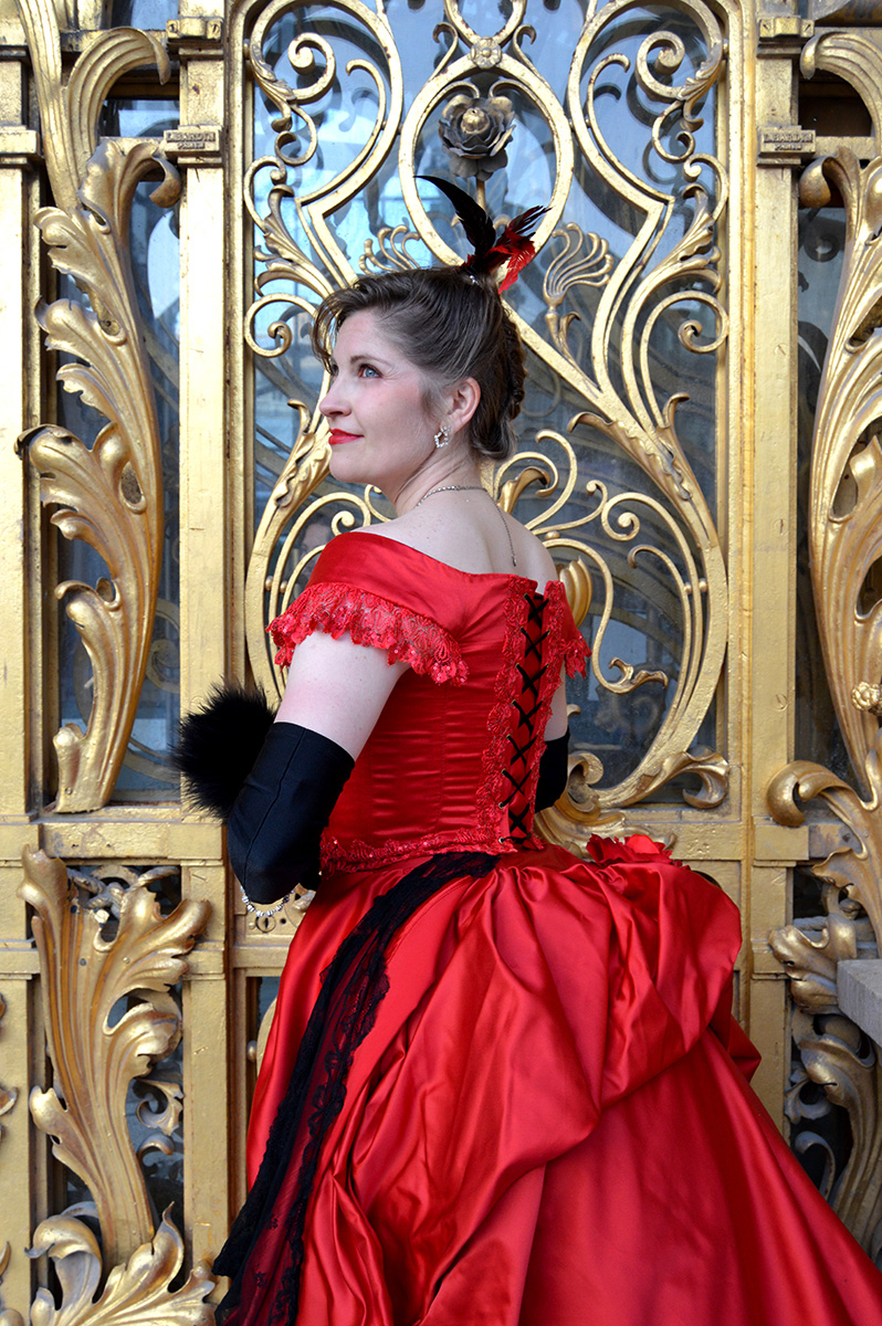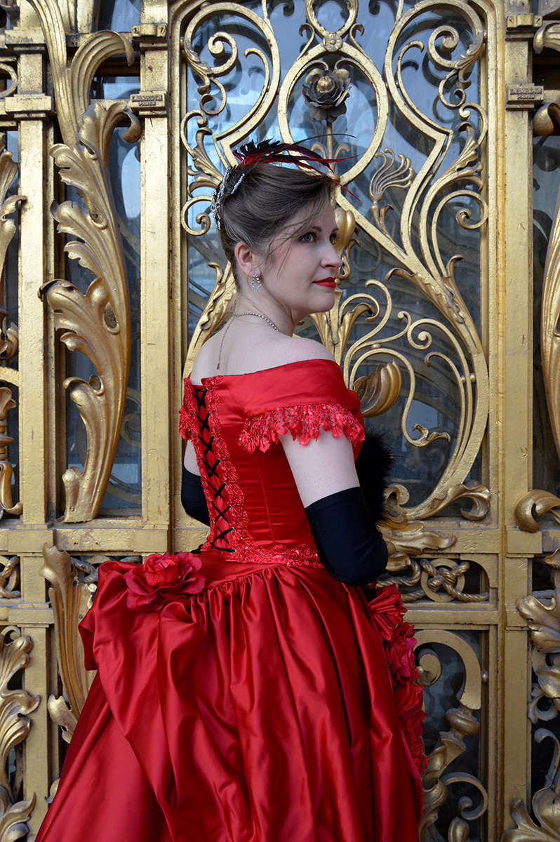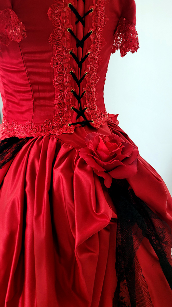 À l’occasion d’un bal donné au Petit Palais, j’ai réalisé cette robe à tournure en satin rouge et dentelle noire. La construction du Petit Palais datant de l’exposition universelle de 1900, je me suis inspirée de cette période pour créer un modèle mêlant “costume historique” et “haute couture”, puisque c’est à cette époque que Charles Frederick Worth “invente” la haute couture.